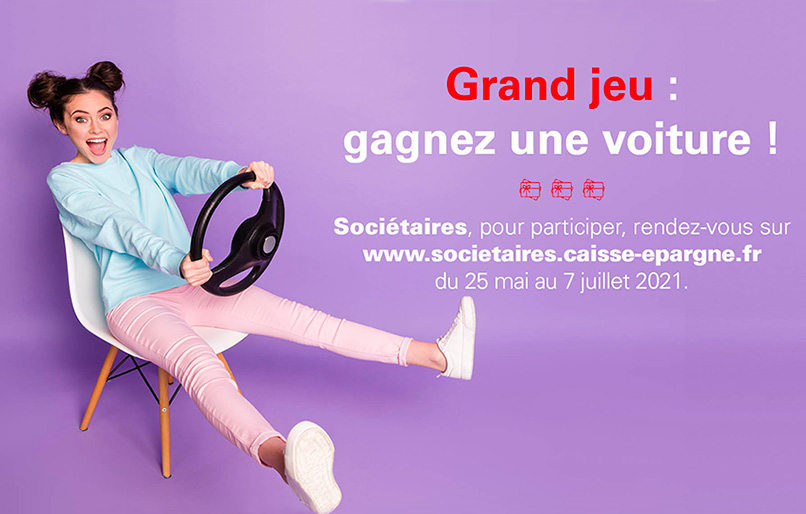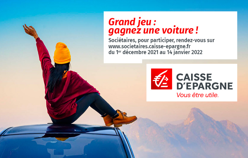 Extrait règlement : Article 1 – Société organisatrice. La Fédération nationale des Caisses d’Epargne, association régie par les dispositions des articles L.512.85 à L.512-105 du Code monétaire et financier, par la loi du 1er juillet 1901 relative au contrat d’association, ayant son siège au 5 rue Masseran à Paris (7ème) (ci-après dénommée la « FNCE »), organise un Grand jeu « Gagnez une voiture ! » pour le compte des Caisses d’Epargne régionales. Ce jeu débutera le 25 mai 2021 à 10h00 et prendra fin au plus tard le 7 juillet à 2021 à 18h00. Article 2 – La participation à ce jeu avec tirage au sort est sans obligation d’achat, de souscription ou d’adhésion aux contrats, produits et services bancaires proposés par la Caisse d’Epargne à sa clientèle. Ce jeu est uniquement disponible sur le site : www.societaires.caisse-epargne.fr . Qui peut participer ? Ce jeu gratuit avec tirage au sort, est ouvert à toute personne physique, majeure, sociétaire d’une Caisse d’Epargne adhérant au dispositif : www.societaires.caisse-epargne.fr (Ci-après dénommée le « Participant »).